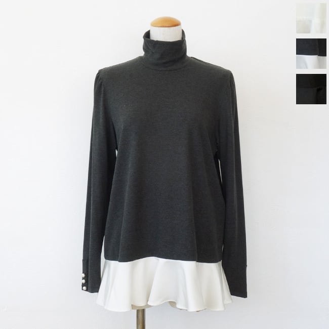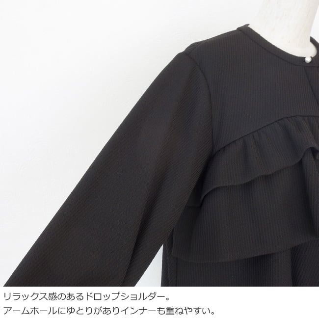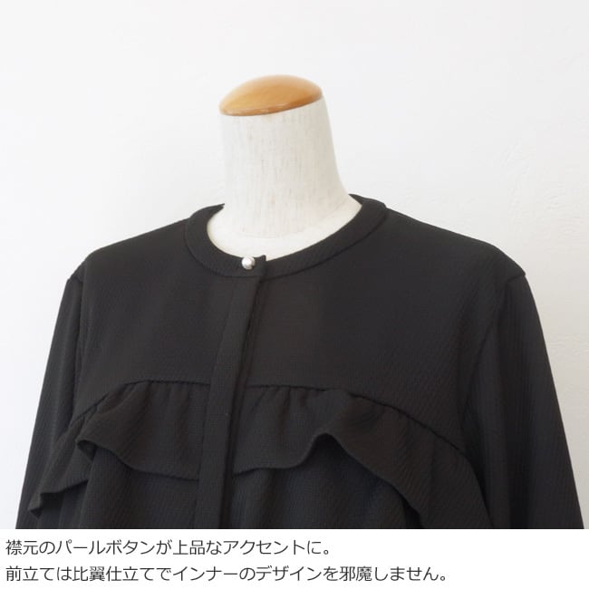 ふっくらとしたフリルやパールボタンが女性らしく華やかなアクセントに。