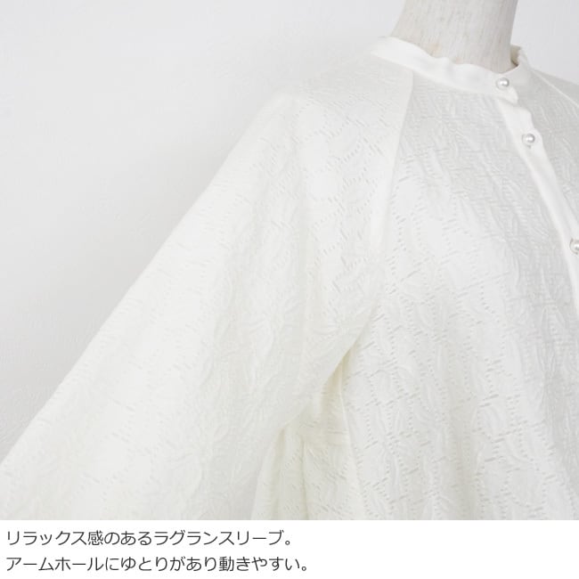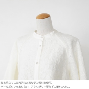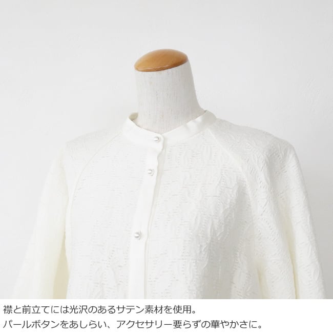 フロントと袖口にあしらったパールボタンが華やかで上品なアクセントに。