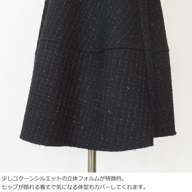 少し丸みのある立体的なフォルムと長めの丈感で体型をカバーしてくれます。