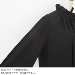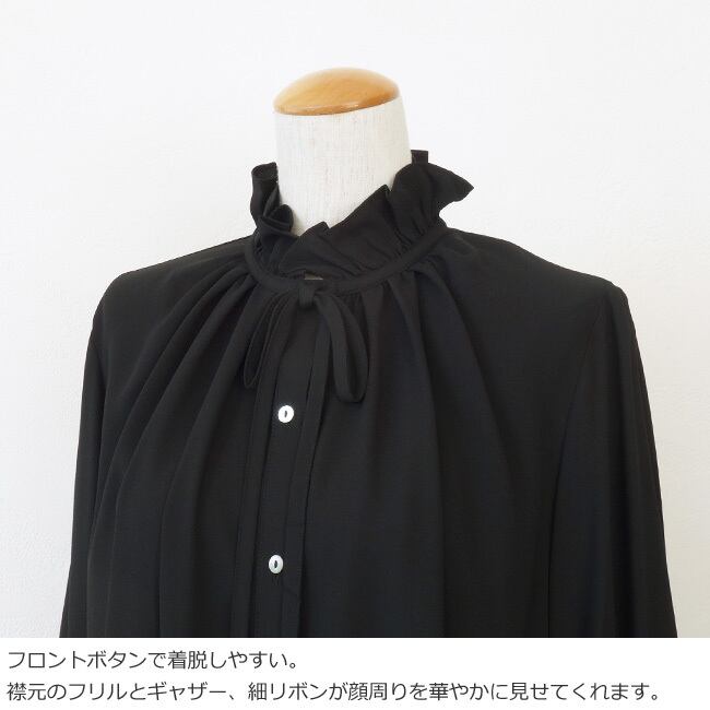 襟元に寄せたフリルとギャザー、華奢なリボンがポイントです。