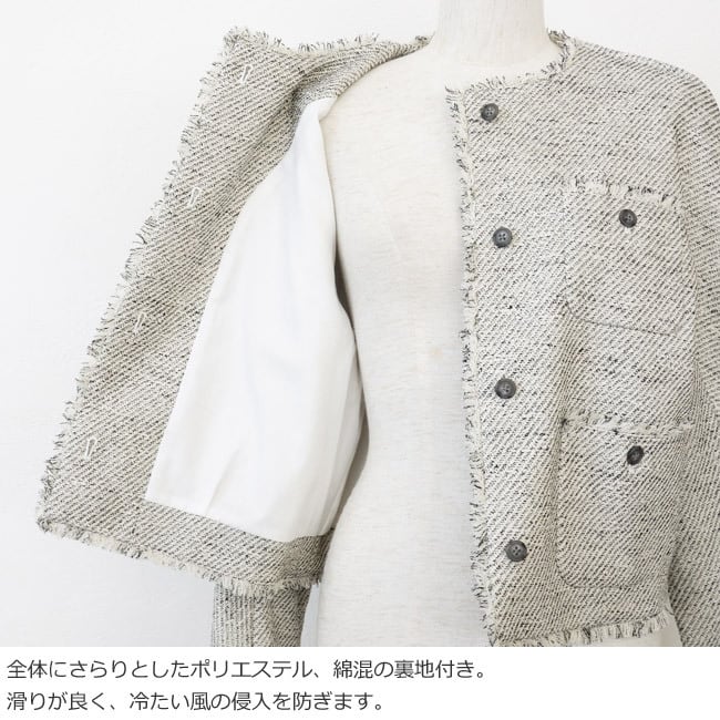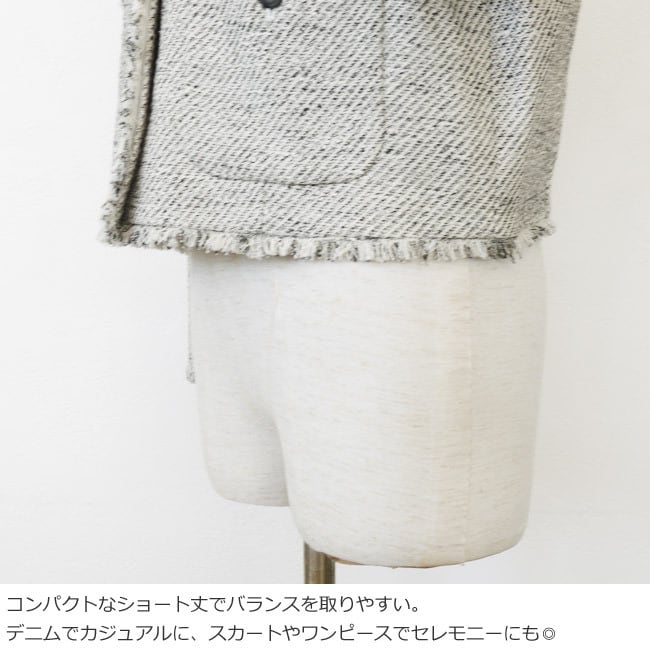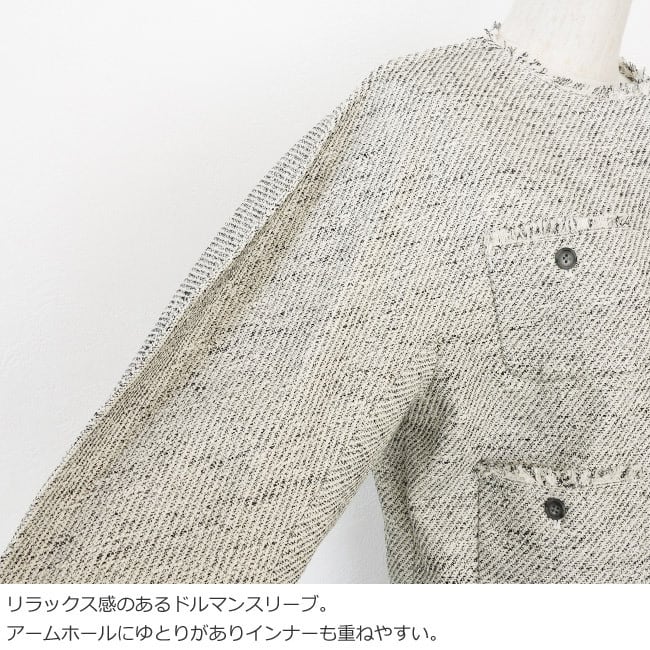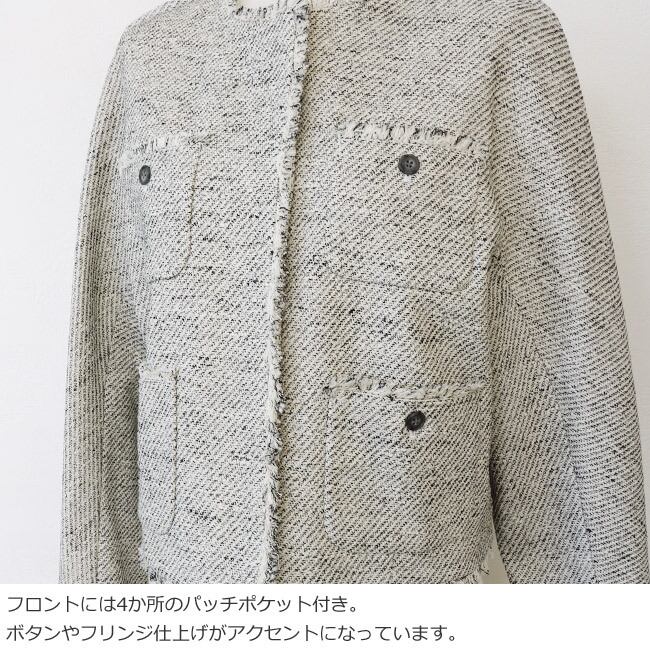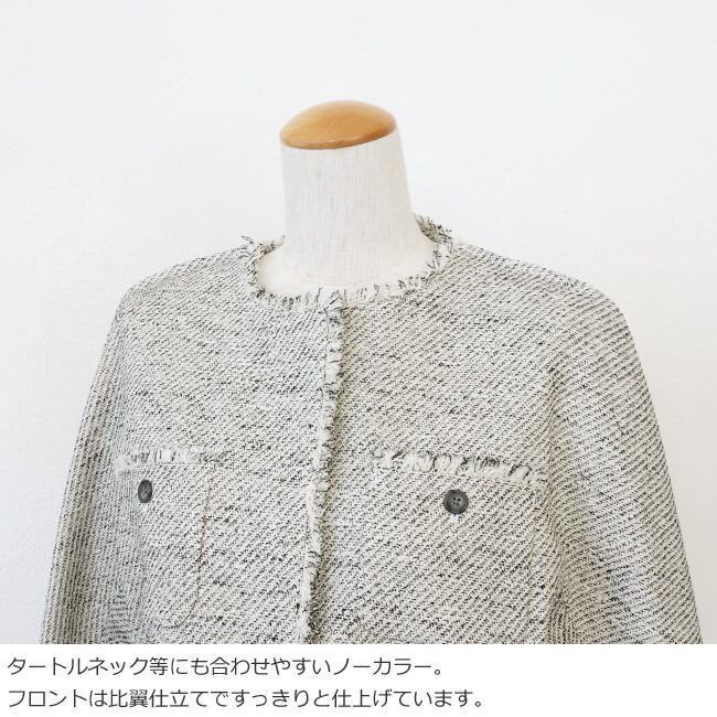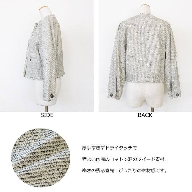 程よい肉感のツイード素材を使用したノーカラージャケット。