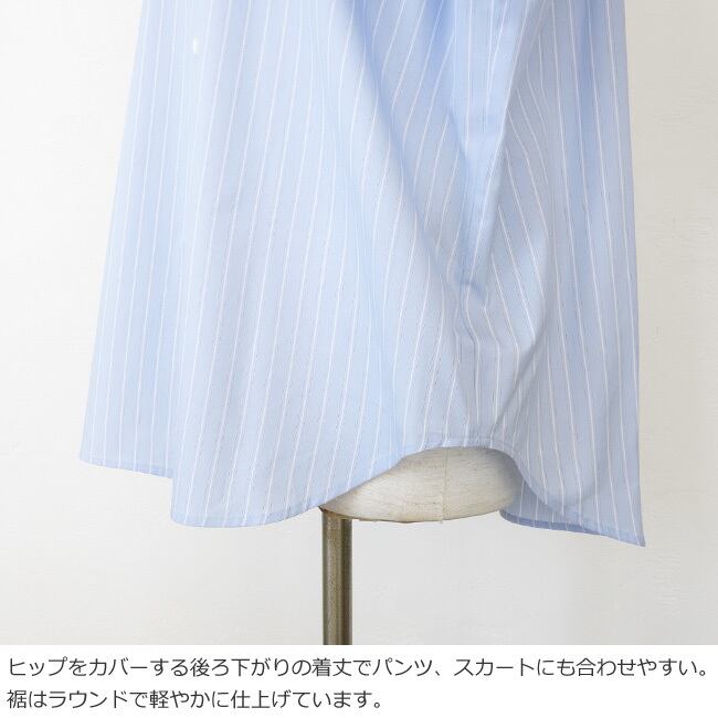 ヒップをカバーする後ろ下がりの着丈で様々なボトムに合わせやすいアイテムです。