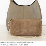 付属のスエード素材のポーチはチェーンハンドル付きで単体での使用もOK。