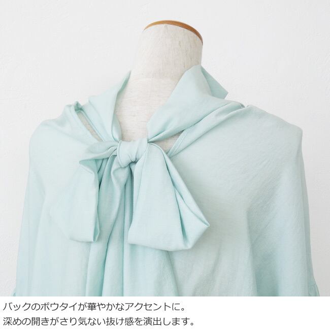 前後どちらでも結べる大きめのボウタイが華やかなアクセントになっています。
