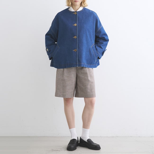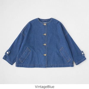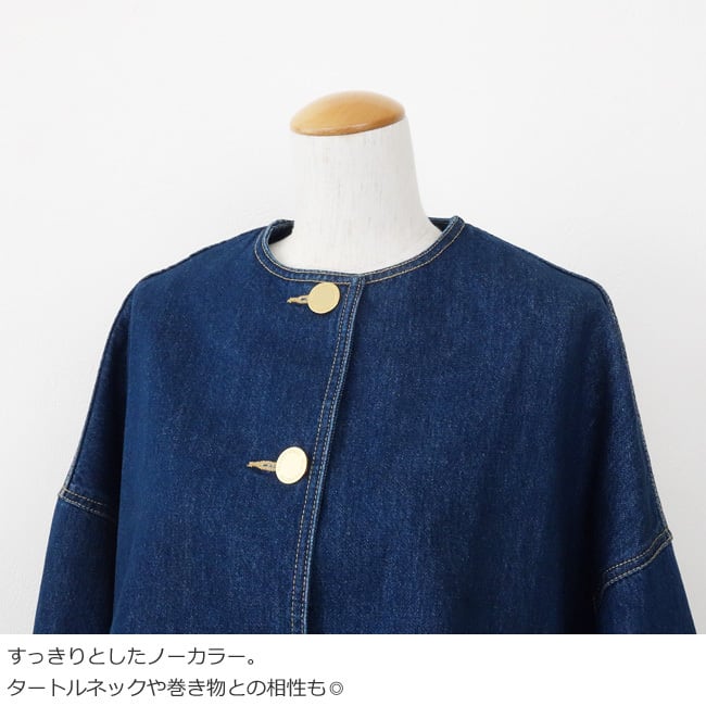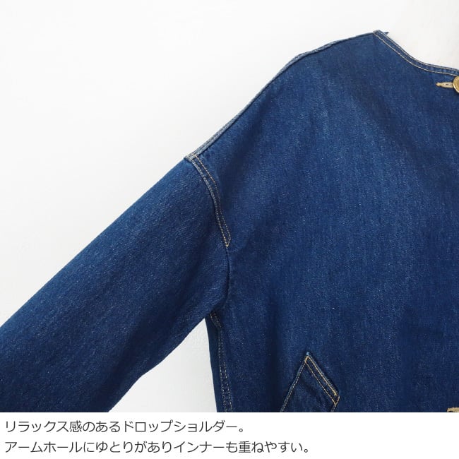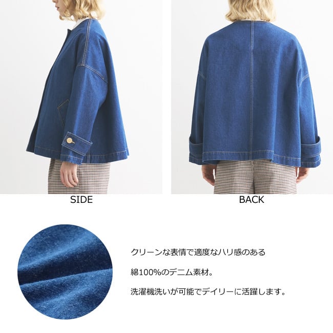程よいハリ感が特徴のデニム素材を使用したノーカラージャケット。
