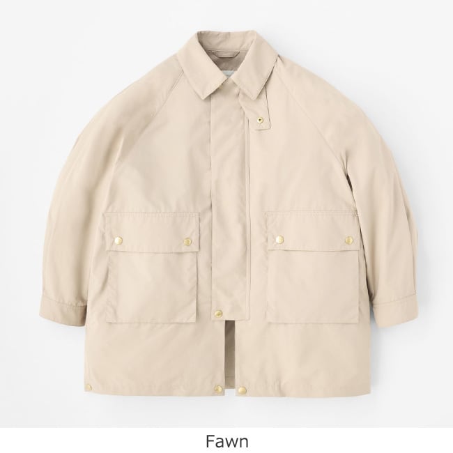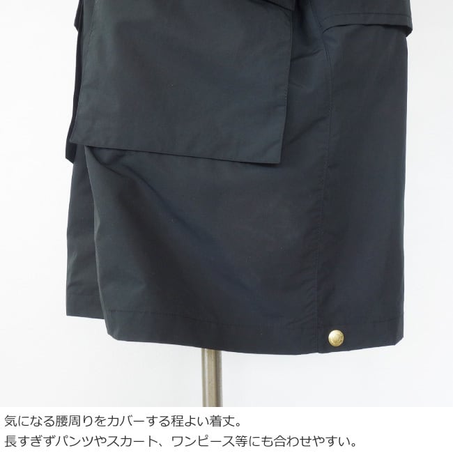 裾を内側に折り返してスナップボタンを留めると着丈が短くなりショートブルゾンに早変わり。