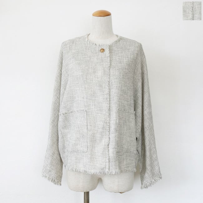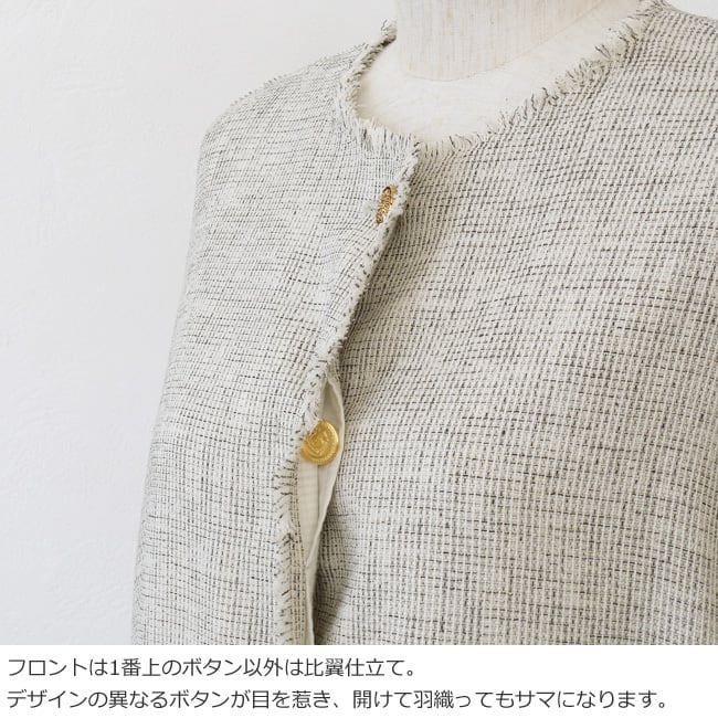ツイードのような表情のメッシュ素材を使用したノーカラージャケット。