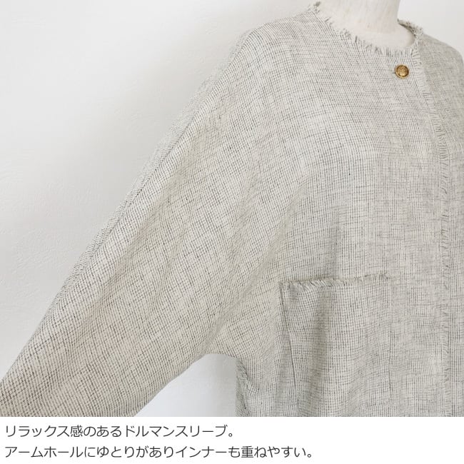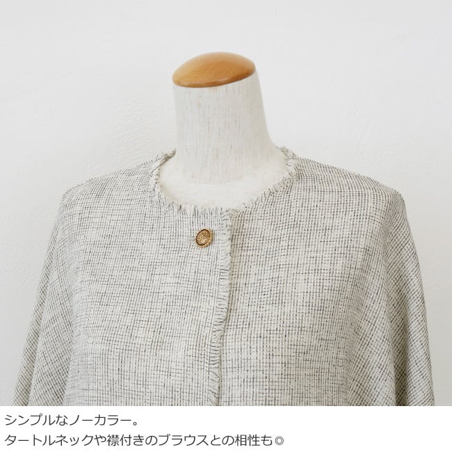 ドルマンスリーブやフリンジ始末でかっちりとしすぎずこなれた印象に仕上げています。