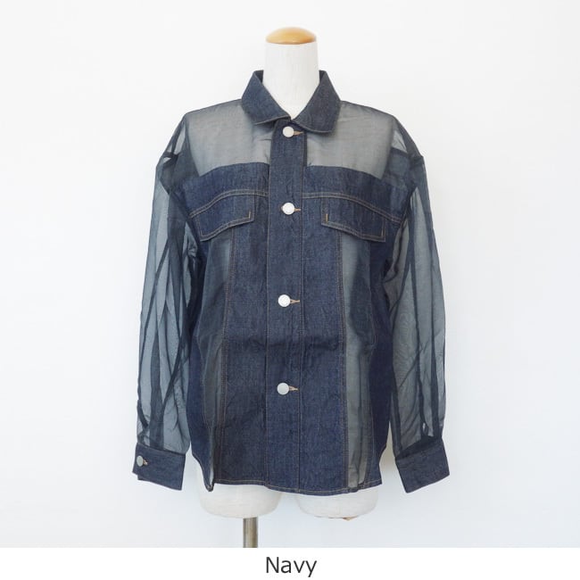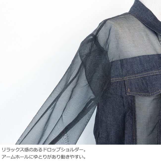 ソフトなデニムとデニムの転写プリントを乗せたオーガンジーの異素材使いがポイントです。