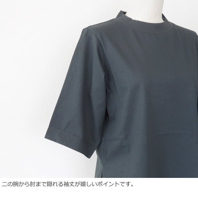 首に沿う太幅の襟や肘まで隠れるハーフスリーブがポイントです。