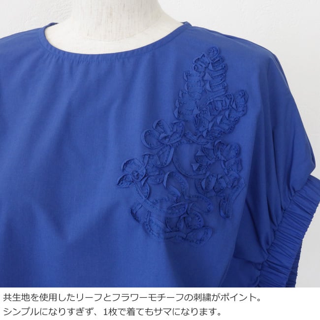 胸元に施したリーフとフラワーモチーフの立体的な刺繍がポイントです。
