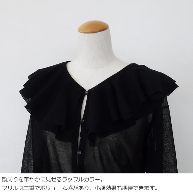 ラッフルカラーが顔周りを華やかに見せ、女性らしく着こなせます。