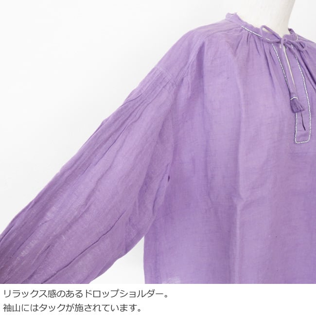袖山と後ろ襟下のタック、袖口のギャザーで女性らしいシルエットに仕上げています。